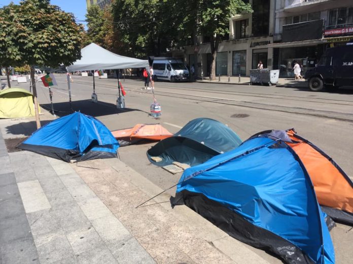 Една полицейска кола денонощно пази останките от неизползвани палатки пред Съдебната палата.