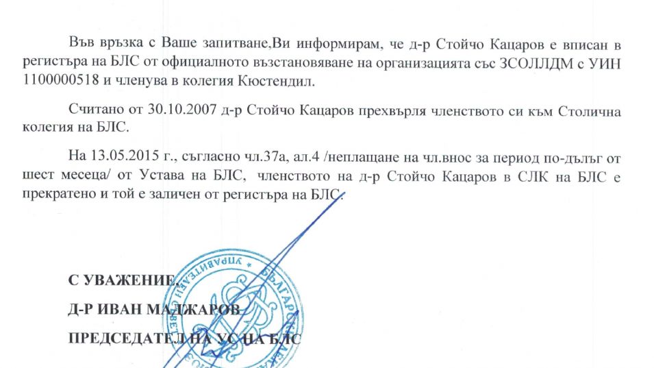 На 13 май 2015 г. заради неплащане на членски внос за период, по-дълъг от шест месеца, членството на д-р Стойчо Кацаров в Столичната колегия на БЛС е прекратено и той е заличен от регистъра на БЛС, съобщи в писмен отговор председателят на Управителния съвет на съюза д-р Иван Маджаров.