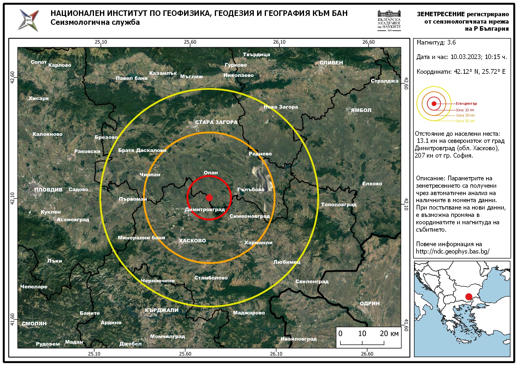 Земетресението е регистрирано североизточно от града в 10:15 чaсa. Усетено е в района на градовете Димитровград, Хасково и Стара Загора.