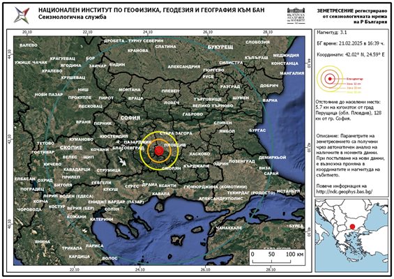 Земетресение с магнитуд 3.1 е станало в района на град Пловдив. Това става ясно от данни на Националния сеизмологичен център към Национален институт по геофизика, геодезия и география – БАН.
