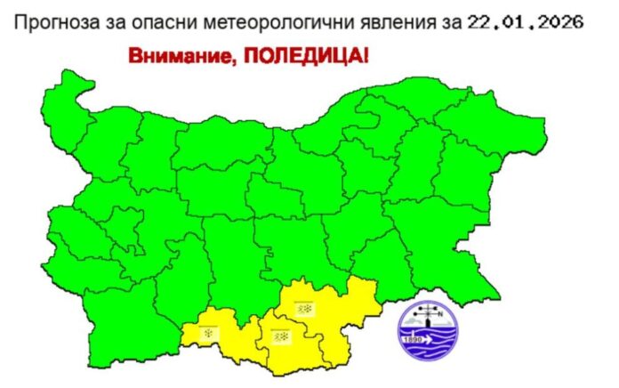 За 22 януари е обявен жълт код за поледици в три области. Предупреждението е в сила за областите Смолян, Хасково и Кърджали.