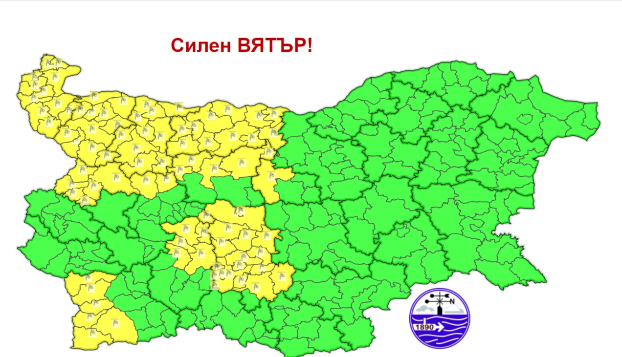 Остава в сила жълт код за 10 области в Западна и Централна България заради силния вятър. Там ще духа силен до бурен северозападен вятър с очаквана скорост 14-19 m/s. Днес облачността ще е променлива, често значителна, но само на изолирани места в източната половина от страната и планинските райони ще превали слабо, предимно сняг.