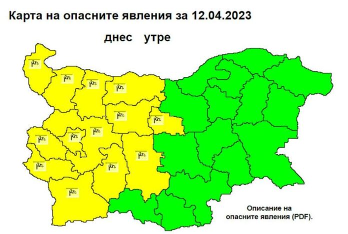 В половин България е обявен жълт код за потенциално опасно време и силен вятър. Предупреждението е в сила за: Видин, Монтана, Враца, Плевен, Ловеч, Габрово, София област, София град, Перник, Кюстендил, Благоевград, Пазарджик и Пловдив.