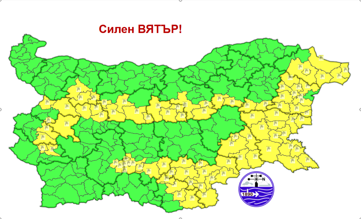 НИМХ обяви жълт предупредителен код за силен вятър за части от Западна, Южна, цялата Източна България и по продължението на Стара планина.