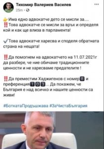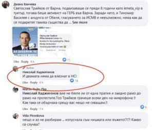 Дясната ѝ ръка Тихомир Василев написа ожесточителен пост срещу адвокат Николай Хаджигенов. „Това адвокатче се мисли за връх и определя кой и как ще влезе в парламента“, написа Василев в свой пост във фейсбук. По думите му Хаджигенов „споделя обратната страна на нещата“ и призовава феновете на „Мутрите“ да не гласуват за него, защото те изповядвали традиционните ценности, и го нарича предател.