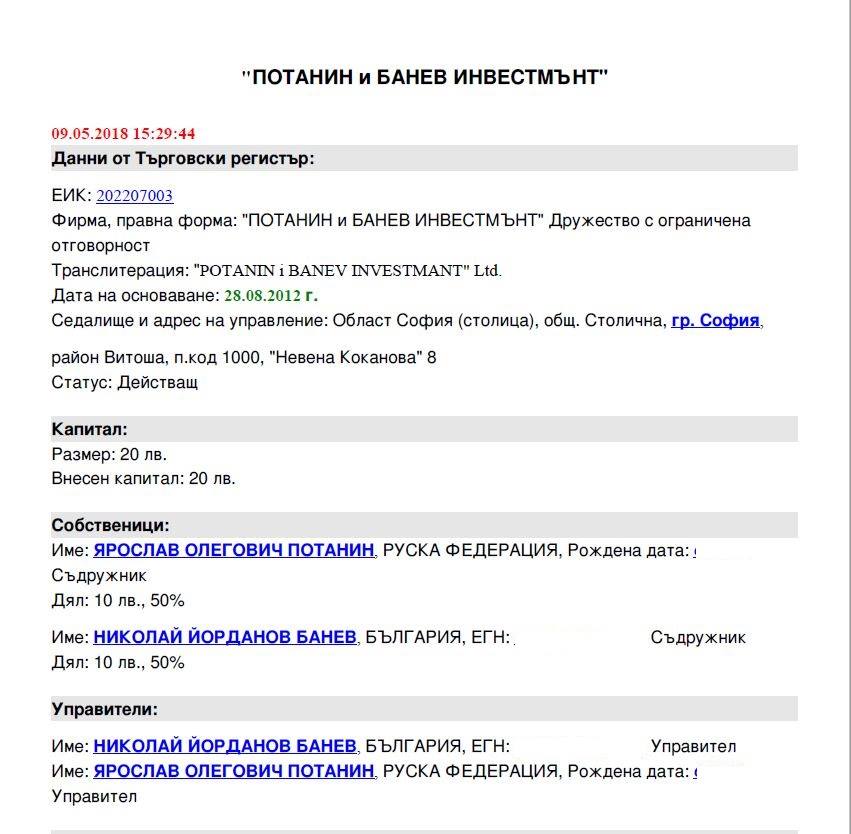 В България Николай Банев и Ярослав Потанин са съдружници в „Потанин и Банев инвестмънт“ ООД, което инвестира по всяка вероятност основно във вече споменатите дейности. След всички положени усилия е обяснима истерията на Банев, който по скрит в килията си телефон зовеше след ареста за „хибридна война“ на Русия срещу България и българските институции.