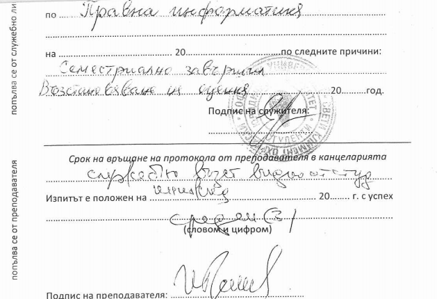 Пореден грозен скандал с фалшификации на документи разтресе Юридическия факултет на Софийския университет ,,Св. Климент Охридски”. Източници от факултета предоставиха на Breaking .bg индивидуални протоколи на студенти, от които е видно, че без да има никакво право заместник-декана проф. д-р Иван Русчев е възстановявал несъществуващи оценки по Информационно право, Правна информатика и Осигурително право.