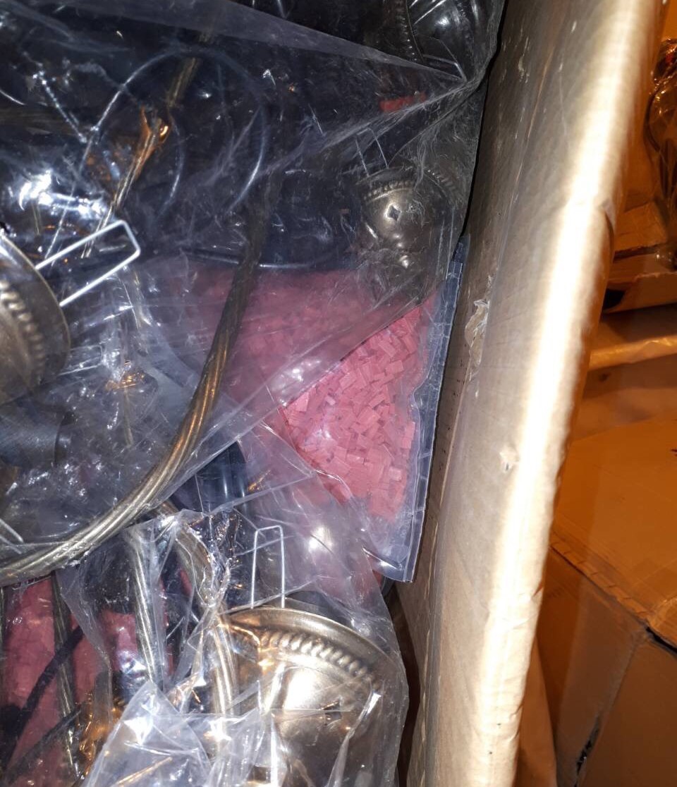 В хода на инспекцията на товара, между стока, натоварена в Холандия – плафониери, са открити и пакети с розови и сини хапчета. При полеви наркотест хапчетата са дали положителен резултат за екстази. Общото количество на откритото наркотично вещество е 63,7 кг, разпределено в 32 пакета. Това съобщиха от МВР.