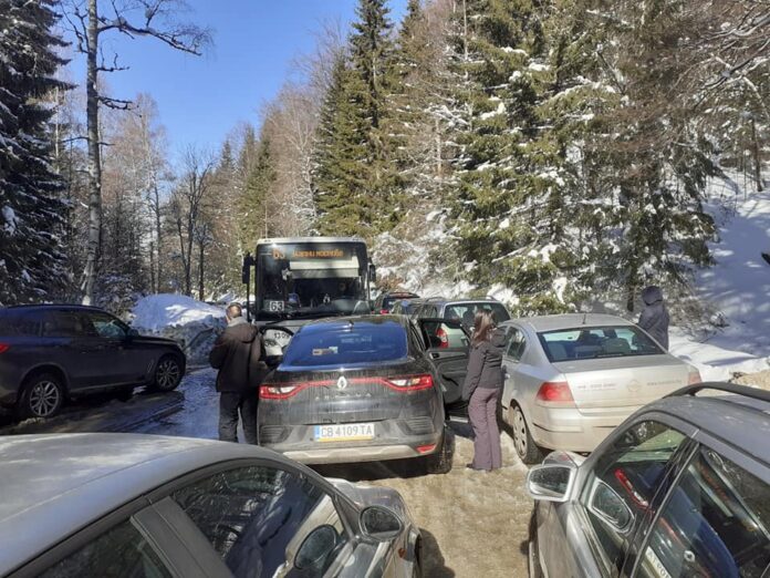 Колоната от автомобили към хижа „Алеко“ започва от Драгалевци и е километрична, но пътят е затворен заради закъсал снегорин. Полицията отбива движението, а в момента оттам не минава и градски транспорт.