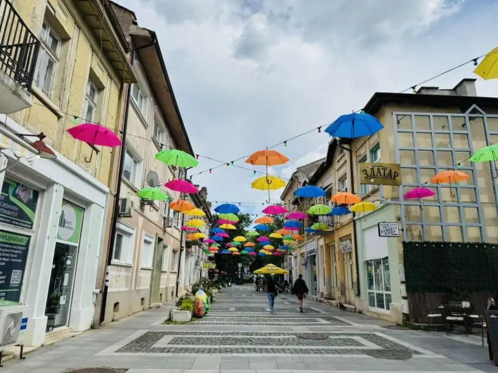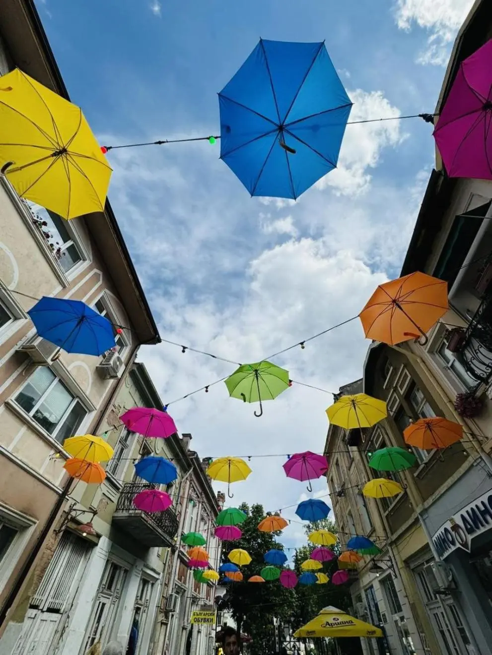Използвани са около 200 цветни чадъра, като украсата допълват поставените преди около година и половина гирлянди с цветни лампички.