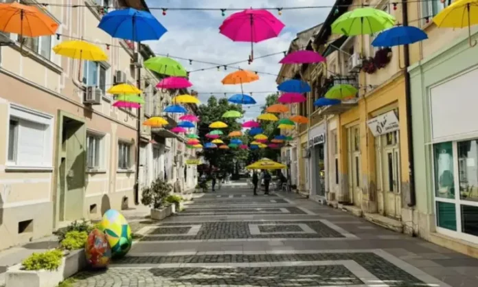 Използвани са около 200 цветни чадъра, като украсата допълват поставените преди около година и половина гирлянди с цветни лампички.