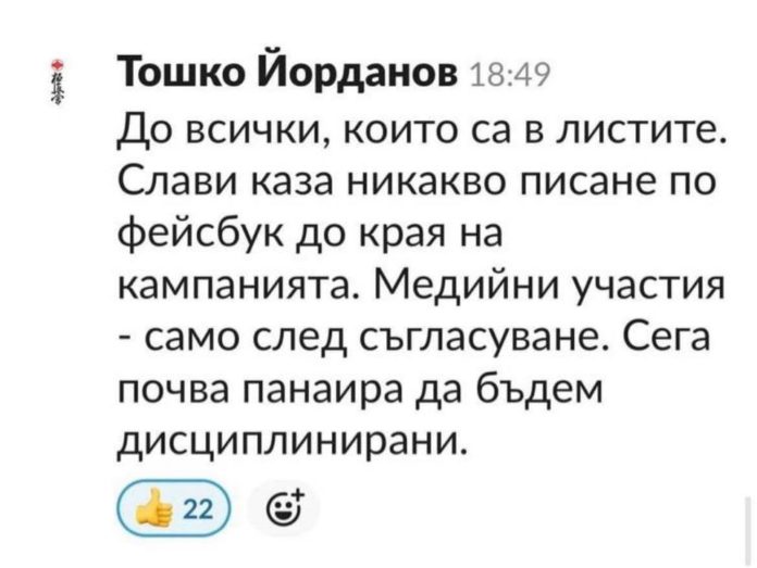 До всички, които са в листите. Слави каза никакво писане по фейсбук до края на кампанията. Медийни участия-само след съгласуване. Сега почва панаира да бъдем дисциплинирани, заповядва Йорданов.
