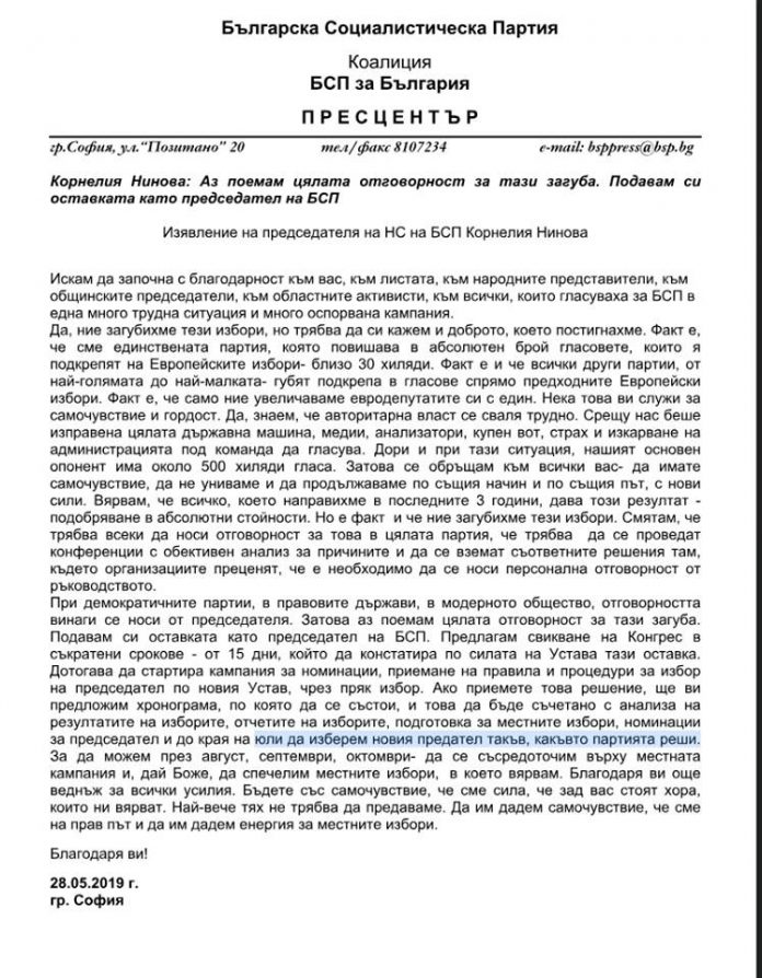 БСП ще избира предАтел вместо председател на партията. Това стана ясно от официалното съобщение на пресцентъра на столетницата с изявлението на Нинова пред Националния съвет днес.