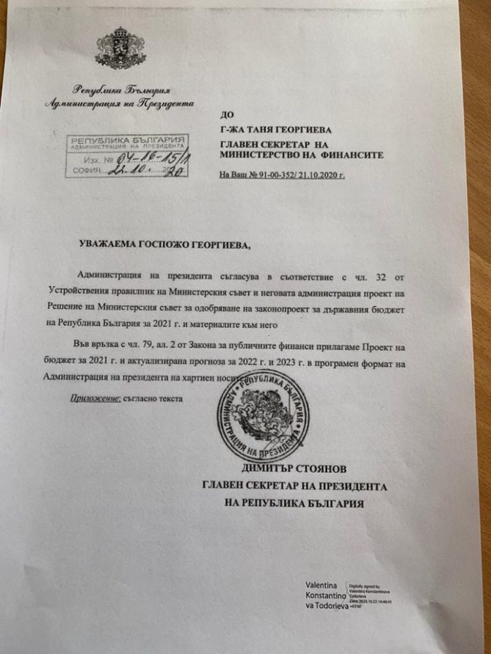 „Позицията на Министерството на финансите и на народни представители от управляващото мнозинство, според които предложеният проект на Закон за държавния бюджет на Република България за 2021 г. е бил съгласуван с президентската администрация, представлява откровена и груба манипулация на фактите.