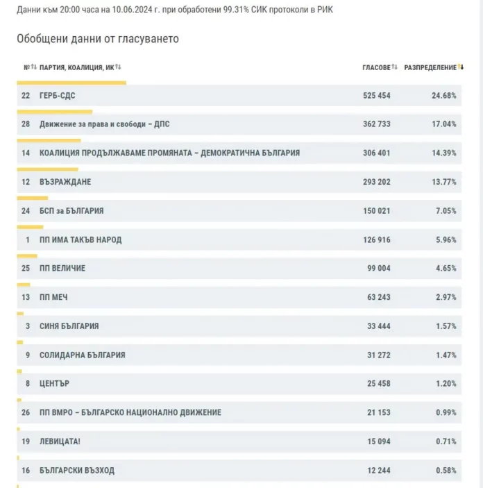 Централна избирателна комисия обяви 99.31% обработени СИК протоколи в РИК към 20.00 часа в деня след вота за Народно събрание.