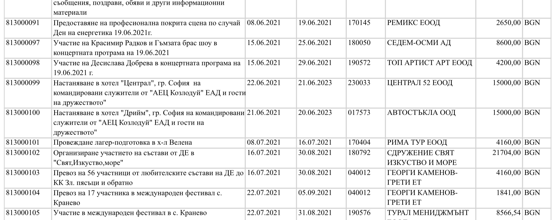 Освен доставката на различни консумативи и материали за осигуряване на дейността си, АЕЦ е сключила миналата година договори с учители по пиано (14 400 лв.), балет (11 000 лв.), театрално изкуство (12 500 лв.), солфеж (10 550 лв.) и шахмат (3000 лв.), които да водят уроци в Деня на енергетика.