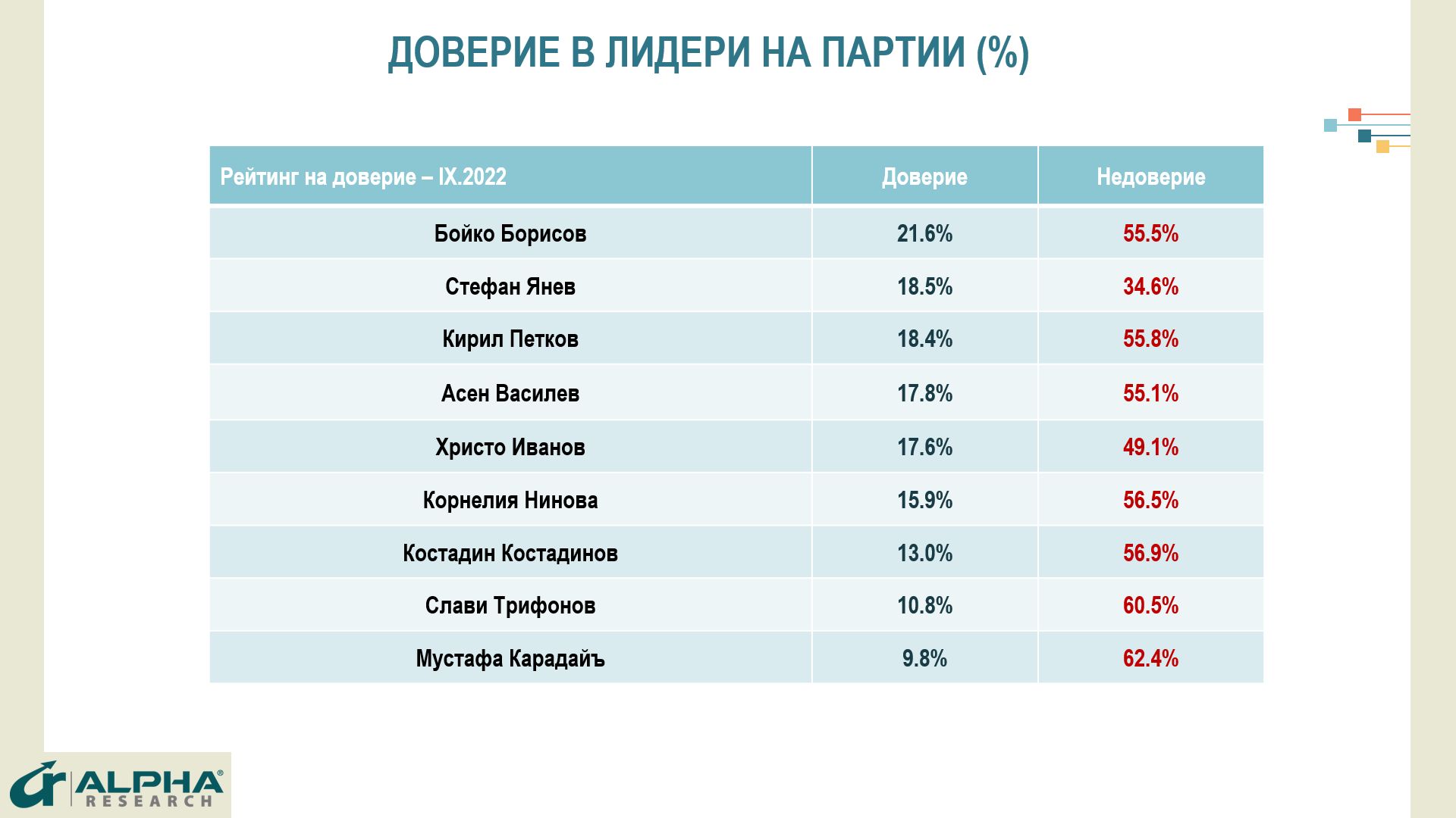 Лидерът на ГЕРБ Бойко Борисов стартира кампанията с 21.6% положителни оценки и 55.5% отрицателни. Съпредседателите на основния опонент, Продължаваме промяната, Кирил Петков и Асен Василев, само за два месеца, бележат рязък спад в личните си рейтинги. С доверие, респективно от 18.4% и 17.8%, те значително стесняват електоралното си влияние в сравнение с миналата година, а недоверието им достига 55-56 на сто. Лидерите на другите две партии, участници в управлявалата доскоро коалиция, Христо Иванов (17.6%) и Корнелия Нинова (15.9%) отстъпват с няколко пункта след тях, като лидерът на ДБ е единственият с по-ниски нива на неодобрение (49%). Всеобщото недоверие към политическата класа обхваща както неучаствалия все още на избори и доскоро с висок позитивен рейтинг Стефан Янев (18.5%:35%), така и най-шумният опозиционен лидер К. Костадинов (13%:57%). В дъното по доверие остава Слави Трифонов (11% : 61%).