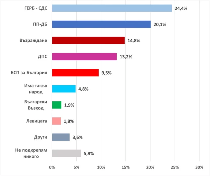 Според проучването, ако изборите бяха днес, шест формации биха били над 4-процентовата бариера – ГЕРБ – СДС (24,4 на сто), ПП – ДБ (20,1 на сто), „Възраждане“ (14,8 на сто), ДПС (13,2 на сто), „БСП за България“ (9,5 на сто) и „Има такъв народ“ (4,8 процента).
