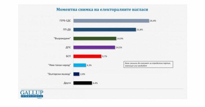 Ако изборите бяха в началото на юли, ГЕРБ-СДС биха получили 26,4% подкрепа, а ПП-ДБ – 21,8 на сто. „Възраждане“ и ДПС щяха да са с почти сходни позиции, съответно 14,9% и 14,5%. БСП остава на пето място с 9,7%. „Има такъв народ“ отново влиза с депутати, след като взема 4,3% от вота. „Български възход“ са много под чертата с 2% подкрепа.