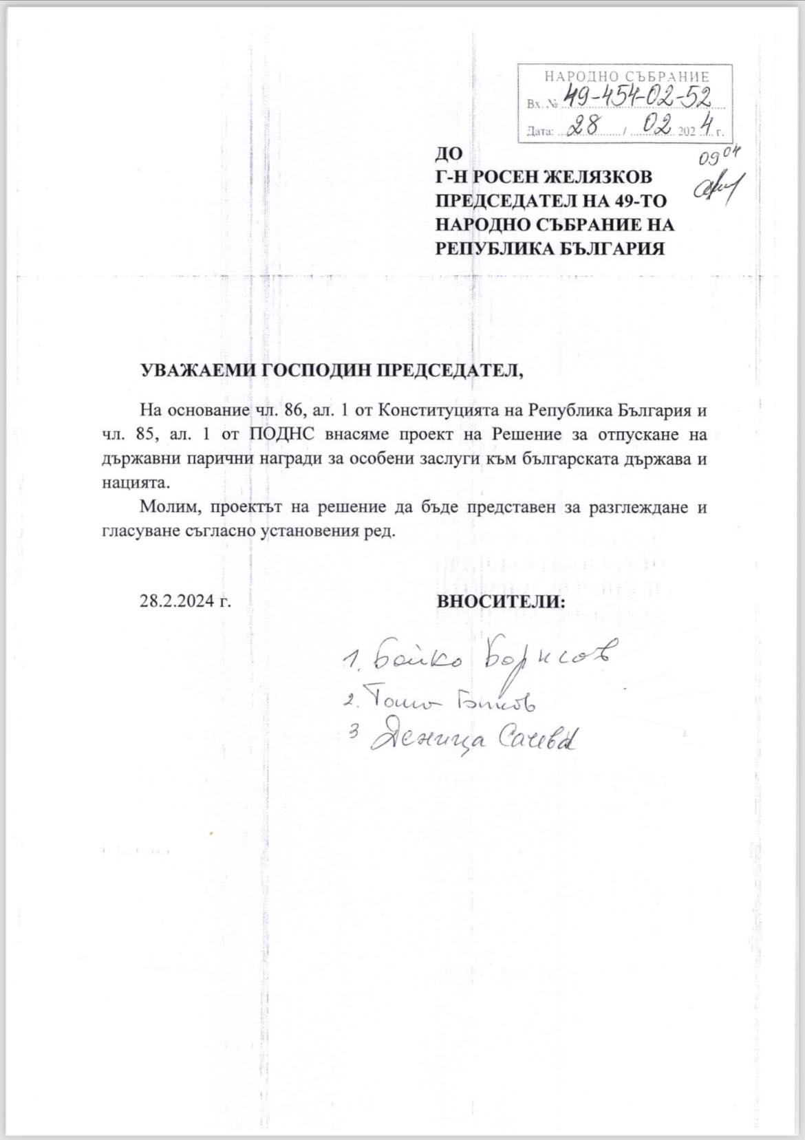 ГЕРБ внесе в парламента предложение на проект за решение за отпускане на държавни парични награди за особени заслуги към българската държава и нацията. Вносители са Бойко Борисов, Тома Биков и Деница Сачева.