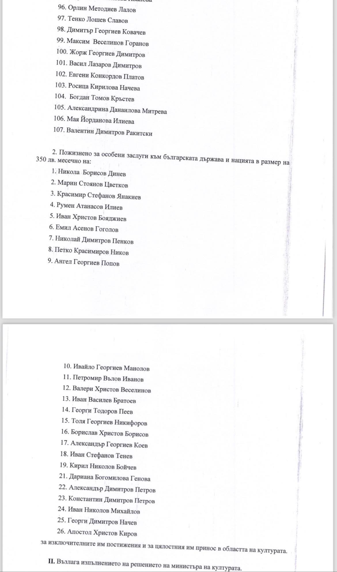 Затова Борисов, Биков и Сачева предлагат държавата да отпусне пожизнени месечни пенсии от 500 лева на над 100 творци и 350 лева на други 26. В приложения списък с естрадни изпълнители се виждат братя Аргирови, Росица Кирилова, Стефка Берова, Богдана Карадочева, Кирил Маричков, Йордан Караджов и Васил Найденов.