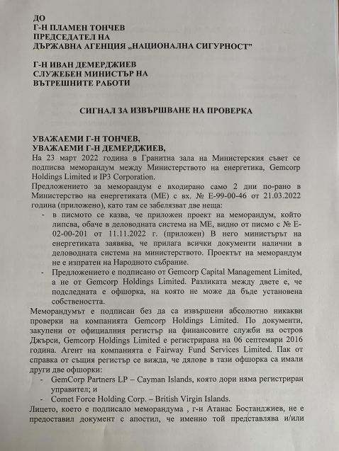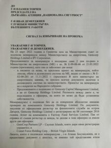 Сигналът е адресиран до председателя на Държавната агенция „Национална сигурност“ Пламен Тончев и до министъра на вътрешните работи Иван Демерджиев.