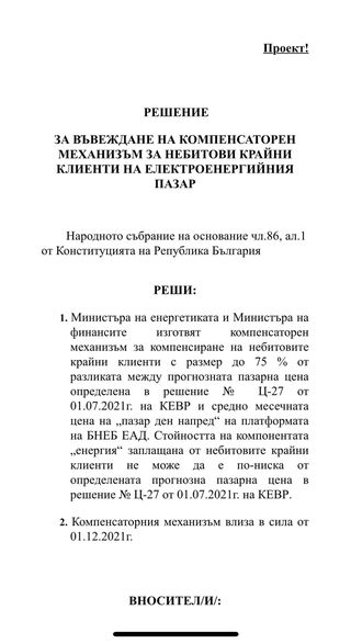 Преди минути внесохме в НС проект на решение за създаване на Механизъм за компенсиране на високите цени в енергетиката. Надявам се народните представители от всички партии да надмогнат партийните си стереотипи и подкрепят предложението. Това ще покаже на българският народ, че в моменти на криза можем да се обединяваме и действаме държавнически.