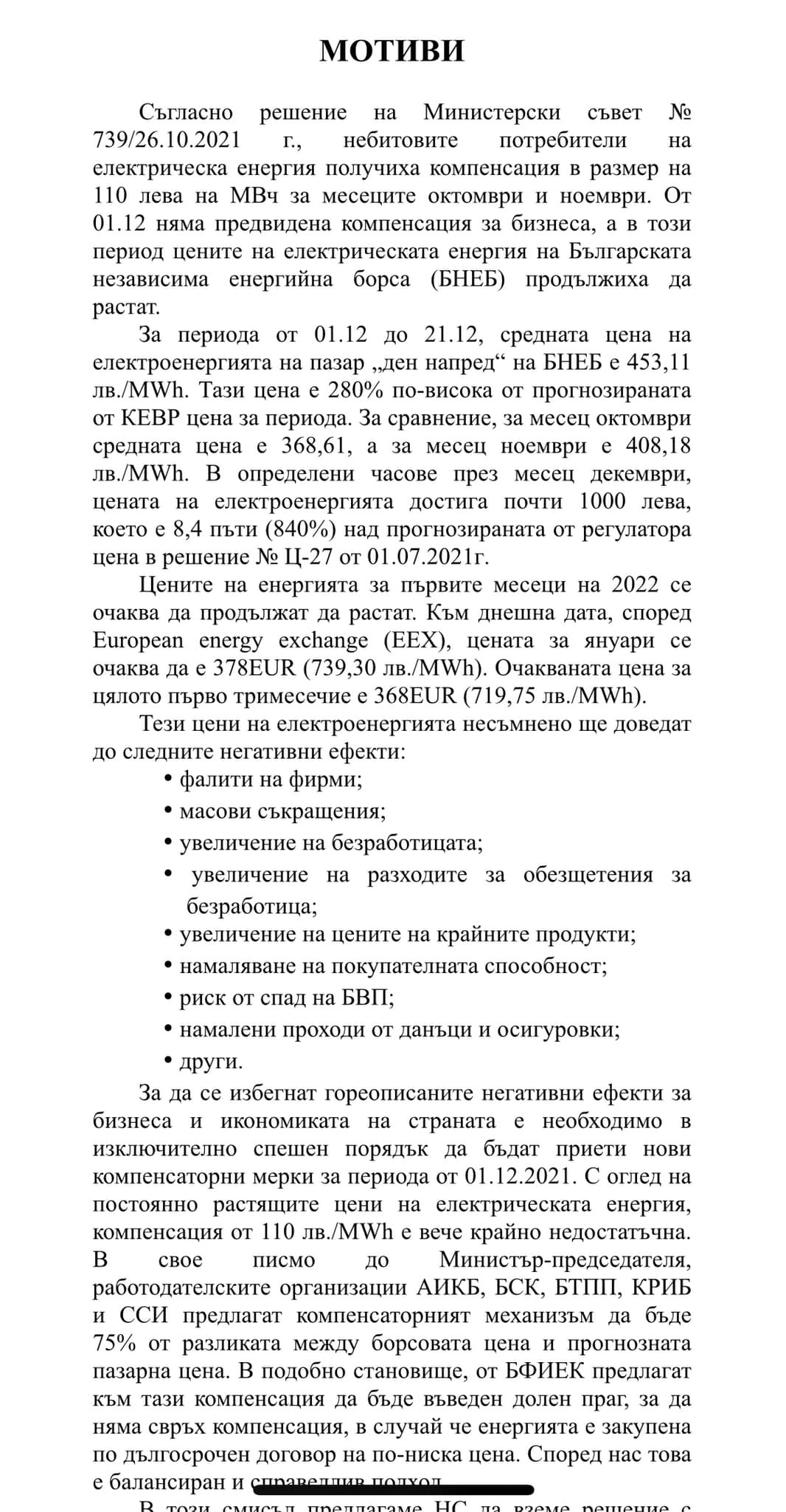 В проекторешението ГЕРБ предлага министрите на финансите и енергетиката да изготвят компенсаторен механизъм за компенсиране на небитовите крайни клиенти с размер до 75% от разликата между прогнозната пазарна цена и средно месечната цена на „пазар ден напред“ на платформата БНЕБ ЕАД.