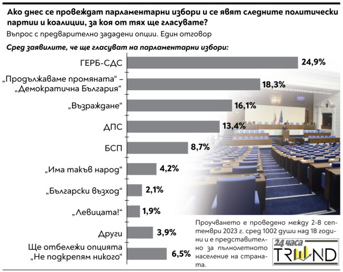 Проучването на „Тренд“ е по поръчка на вестник „24 часа“. Изследването е реализирано в периода между 2 и 8 септември 2023 г. чрез пряко полустандартизирано интервю „лице в лице“ с таблет сред 1002 души на възраст 18+.