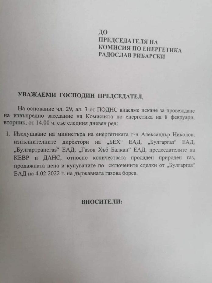 По време на заседанието ще бъдат изслушани министъра на енергетиката Александър Николов, както и изпълнителните директори на БЕХ, Булгаргаз, Булгартрансгаз и Газов Хъб Балкан. За изслушване пред депутатите са поканени и председателите на КЕВР и ДАНС. Всички представители на институциите ще бъдат питани за детайлите по сделката за продажбата на природен газ от Булгаргаз на 4.02.2022 г. на държавната газова борса.