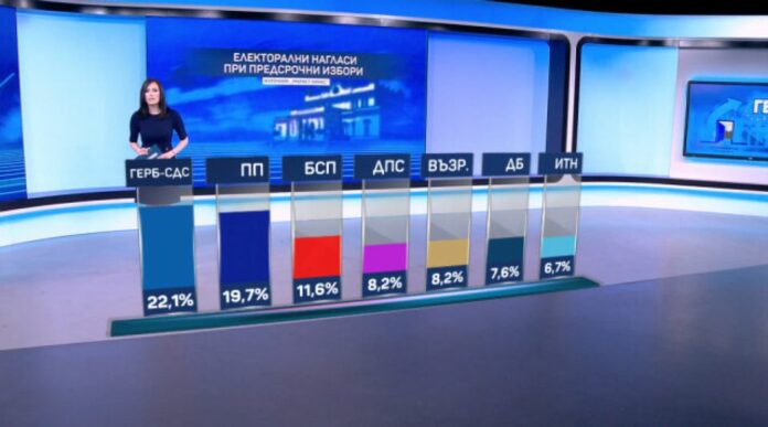 Ако изборите бяха днес ГЕРБ получават малко над 22 %, след тях са ПП с 19 на сто подкрепа. Трета е БСП с 11, 6%, четвърти ДПС и „Възраждане“ със сходен резултат от 8%. При предсрочни избори в парламента ще влязат ДБ с 7,6% и ИТН с 6,7% подкрепа, сочат данните. Проучването показва, че подкрепата за кабинета на Кирил Петков пада с 10% в сравнение с януари. Сходна е и оценката на парламента-15% одобрение.