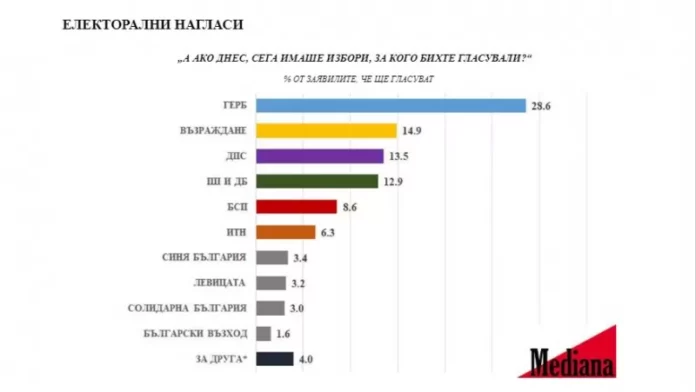 ГЕРБ – 28.6%, „Възраждане“-14.9%, ДПС-13.5%, ПП-ДБ-12.9,БСП-8.6% Шанс за парламента има и ИТН – 6.3%.