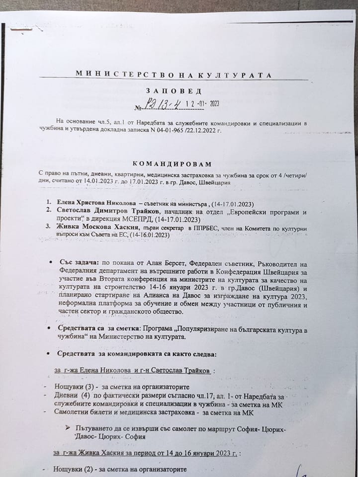 Това е заповед на министъра на културата Велислав Минеков за командироване на политкомисаря Светослав Трайков в Давос.