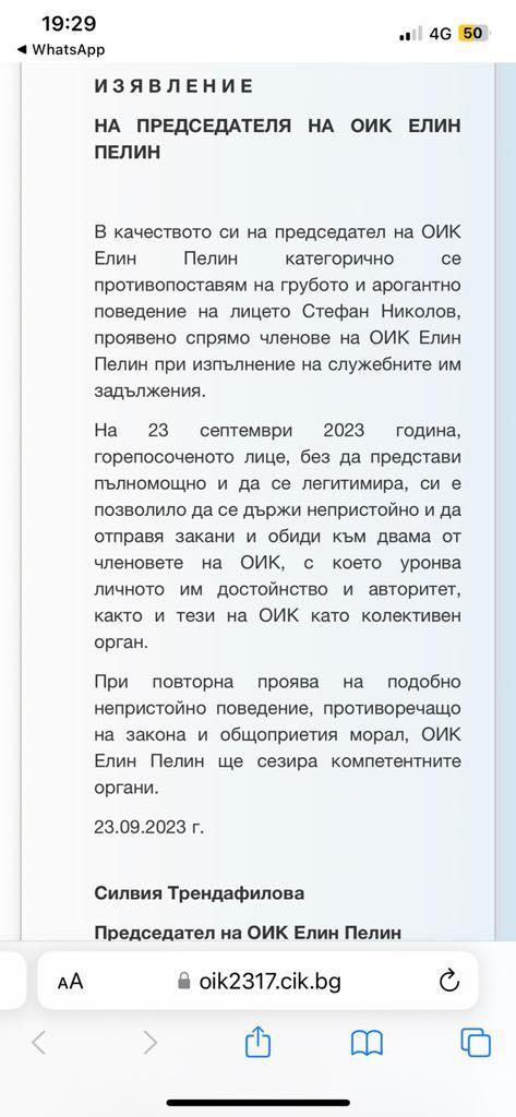 „В качеството си на председател на ОИК Елин Пелин категорично се противопоставям на грубото и арогантно поведение на лицето Стефан Николов, проявено спрямо членове на ОИК Елин Пелин при изпълнение на служебните им задължения“, обяви Трендафилова миналата вечер. И разказа за случая. „На 23 септември 2023 година, горепосоченото лице, без да представи пълномощно и да се легитимира, си е позволило да се държи непристойно и да отправя закани и обиди към двама от членовете на ОИК, с което уронва личното им достойнство и авторитет, както и тези на ОИК като колективен орган“, заяви Трендафилова. И допълни: „При повторна проява на подобно непристойно поведение, противоречащо на закона и общоприетия морал, ОИК Елин Пелин ще сезира компетентните органи.“
