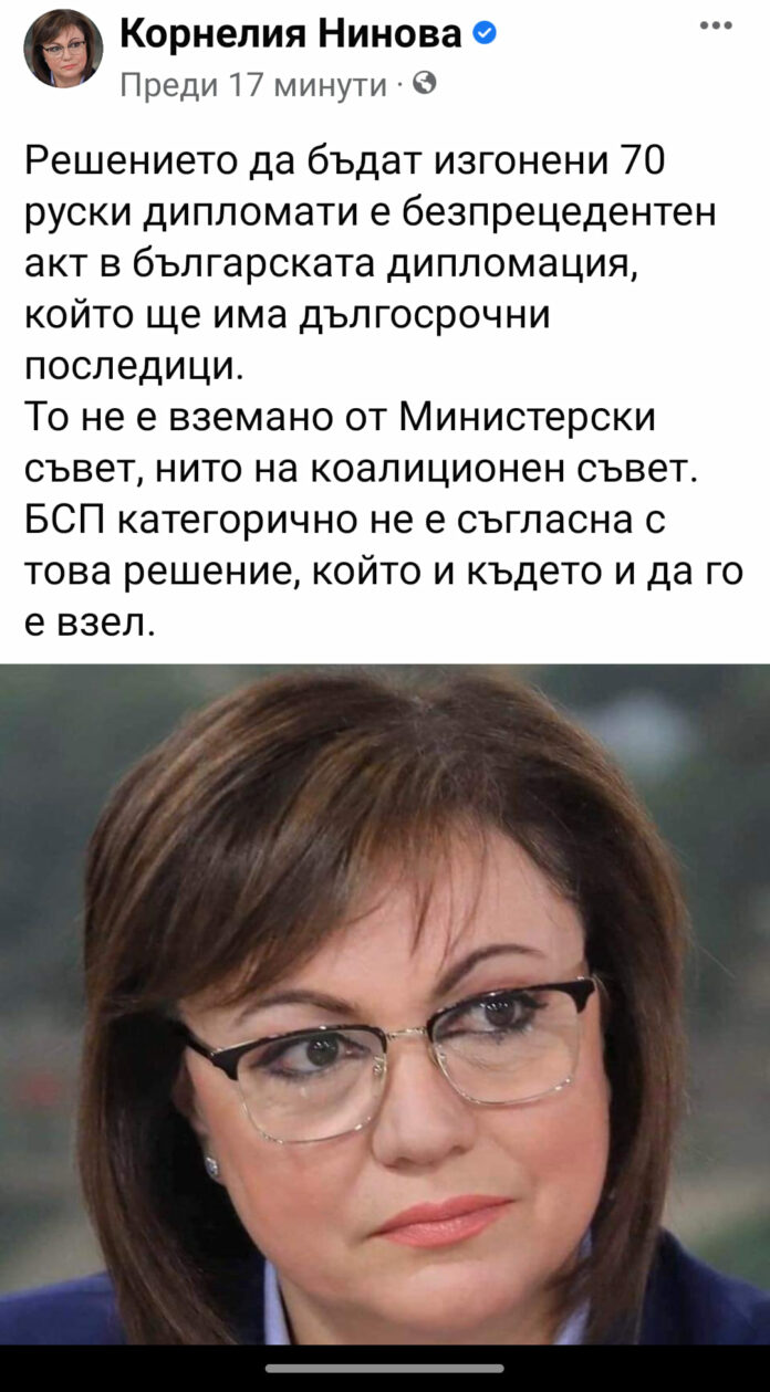 „Решението да бъдат изгонени 70 руски дипломати е безпрецедентен акт в българската дипломация, който ще има дългосрочни последици. То не е вземано от Министерски съвет, нито на коалиционен съвет. БСП категорично не е съгласна с това решение, който и където да го е взел“, написа Нинова.