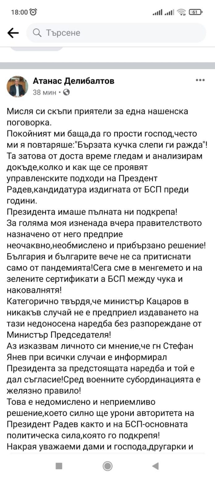 Общинският председател на БСП в Сливен нападна остро президента Румен Радев в свой пост във фейсбук и обяви, че сваля доверието от него. Ето какво написа Атанас Делибалтов :