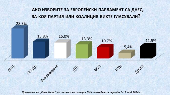 ГЕРБ води убедително с 28,3%, следват ППДБ с 15,8, „Възраждане“ са с 15, а ДПС е с 13,3%.