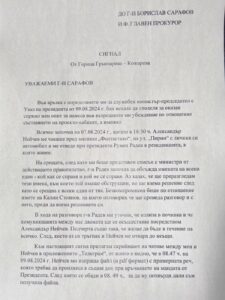 Към настоящият сигнал прилагам скрийншот на чатове между мен и Нейчев в приложението „Телеграм“, от които е видно, че в 08.47 ч. на 09.08.2024 г. Нейчев ми изпраща файл (в pdfформат) с примерната реч, която трябва да произнеса в същия ден при връчването на мандата от Президента. След което се обади в 08.49 ч., за да му потвърдя дали съм получила файла.