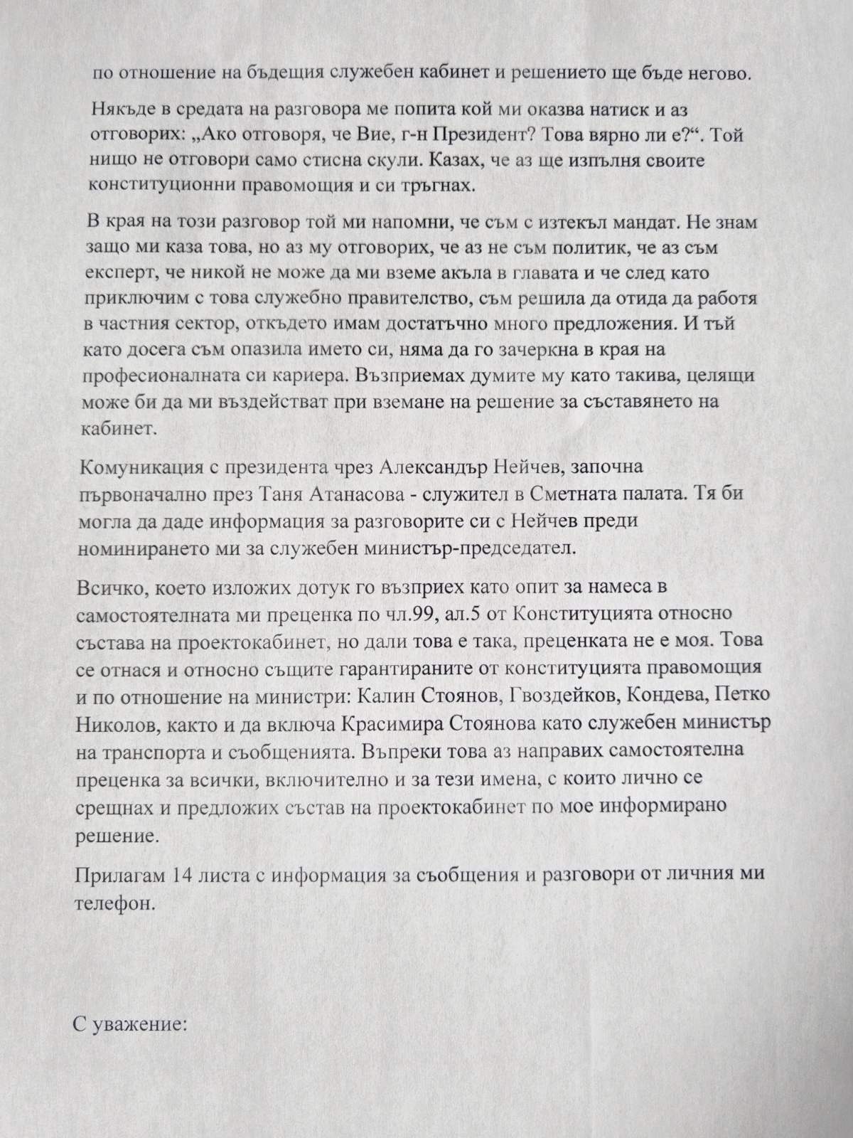 Всичко, което изложих дотук го възприех като опит за намеса в самостоятелната ми преценка по чл.99, ал.5 от Конституцията относно състава на проектокабинет, но дали това е така, преценката не е моя. Това се отнася и относно същите гарантирани от конституцията правомощия и по отношение на министри: Калин Стоянов, Гвоздейков, Кондева, Петко Николов, както и да включа Красимира Стоянова като служебен министър на транспорта и съобщенията. Въпреки това аз направих самостоятелна преценка за всички, включително и за тези имена, с които лично се срещнах и предложих състав на проектокабинет по мое информирано решение.