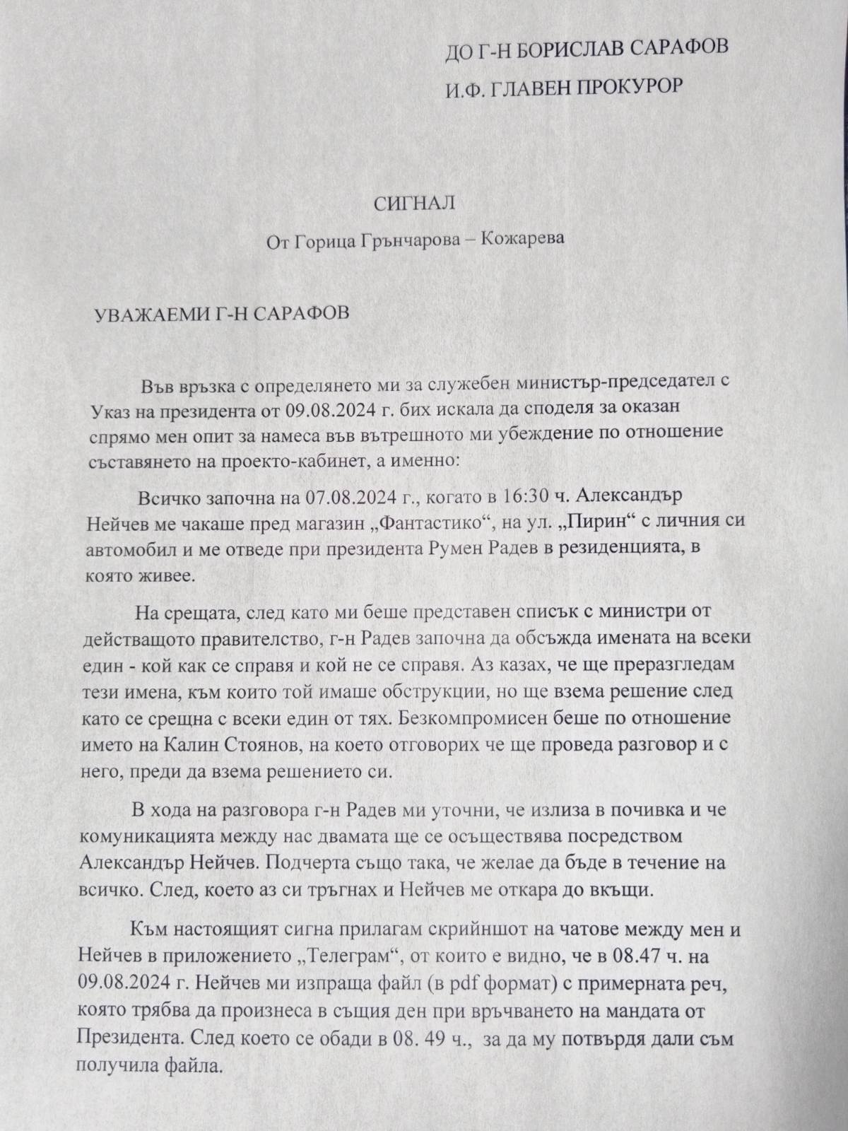 Към настоящият сигнал прилагам скрийншот на чатове между мен и Нейчев в приложението „Телеграм“, от които е видно, че в 08.47 ч. на 09.08.2024 г. Нейчев ми изпраща файл (в pdfформат) с примерната реч, която трябва да произнеса в същия ден при връчването на мандата от Президента. След което се обади в 08.49 ч., за да му потвърдя дали съм получила файла.