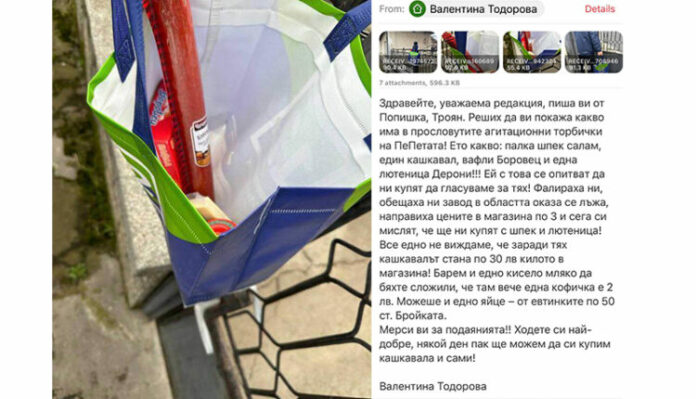 „Палка шпек салам, един кашкавал, вафли Боровец и една лютеница Дерони!!! Ей с това се опитват да ни купят да гласуваме за тях!“, разгневено ни пише Валентина Тодорова.