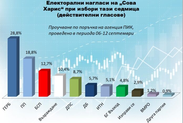 Ако изборите бяха тази седмица, ГЕРБ-СДС биха получили 28,8% от действителните гласове, а ПП – 18,8%. Фаворит за третото място се очертава БСП с 12,7%, което означава частично възстановяване на позициите на социалистите.