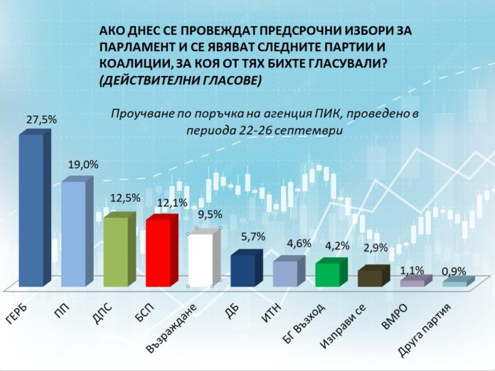 ГЕРБ води на „Продължаваме промяната“ с 8,5% три дни преди изборите на 2 октомври. Това сочи най-новото проучване на социологическа агенция „Сова Харис“ по поръчка на ПИК. За преминаване на 4-процентовата бариера и влизане в следващия парламент продължават да се борят партиите на Слави Трифонов и Стефан Янев. Близо до чертата да изпадне от Народното събрание е и „Демократична България.