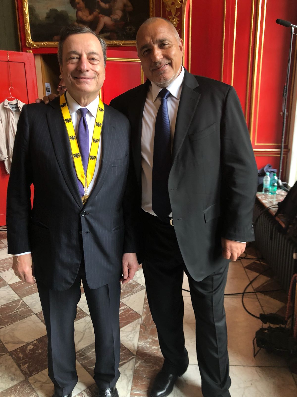 Премиерът Бойко Борисов разговаря с управителя на Европейската централна банка Марио Драги в Аахен, където е за церемонията по връчването на годишната Международна награда „Карл Велики“.