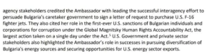 Главният инспектор на Държавният департамент посочва, че посланикът е успяла „да убеди служебното правителство на България да подпише искане за закупуване на американски изтребители F-16“. Тъй като докладът е от май 2022 г., това означава, че служебното правителство, за което се говори в доклада, е на Стефан Янев.