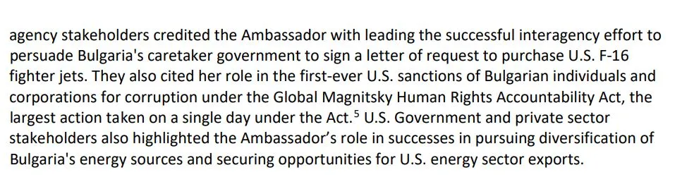 Главният инспектор на Държавният департамент посочва, че посланикът е успяла „да убеди служебното правителство на България да подпише искане за закупуване на американски изтребители F-16“. Тъй като докладът е от май 2022 г., това означава, че служебното правителство, за което се говори в доклада, е на Стефан Янев.
