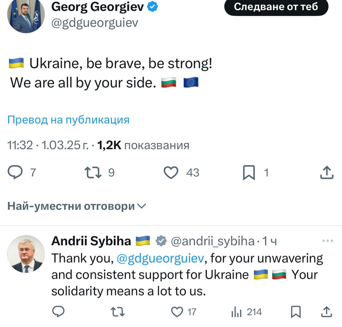 „Благодаря, @gdgueorguiiev, за непоколебимата и постоянна подкрепа за Украйна. Вашата солидарност означава много за нас!“