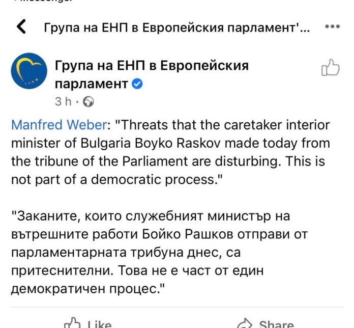 Предсадателят на групата на ЕНП в Европейския парламент Манфред Вебер реагира остро на изстъпленията на служебния вътрешен министър Бойко Рашков в Народното събрание.