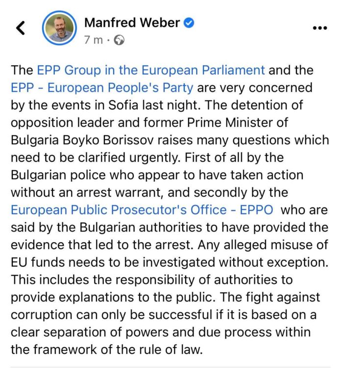 Групата на Европейската народна партия в Европейския парламент са много загрижени от събитията в София снощи. Това написа в социалните мрежи лидерът на групата на ЕНП Манфред Вебер. Ето какво каза още Вебер:
