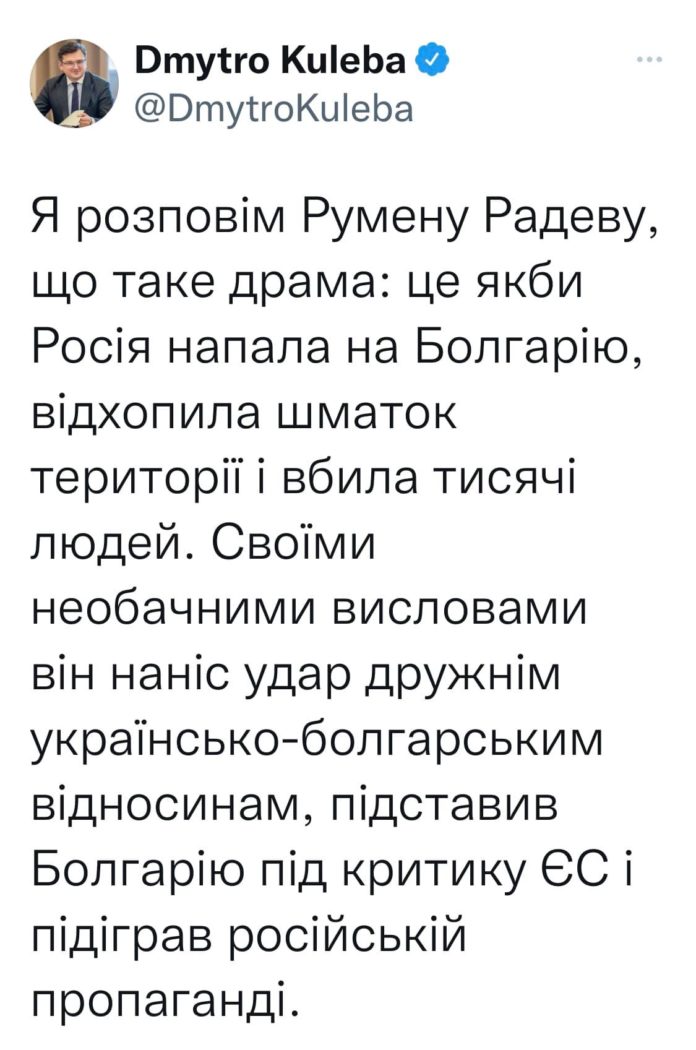 Ще му кажа на Румен Радев какво е драма: Русия да нападне България, да анексира част от територията, да убие хиляди. С неговите безразсъдни коментари той нанесе удар на приятелските отношения на България и Украйна и изложи България на критики от ЕС и подкрепи руската пропаганда.